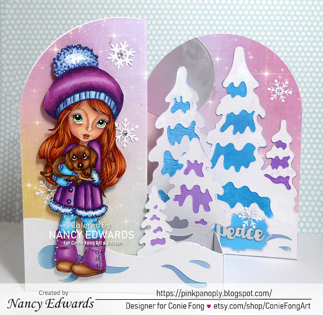 I knew this Dreaming Tree SVG would be perfect for a special Anniversary card. The elegant couple are originally cut as silhouettes but I summoned up the courage to draw faces on them and I'm happy with my attempt. I won't win any art awards, but both of the recipients are artists themselves, so I knew they would appreciate my effort. I paper pieced the wedding dress with gold and white glittered cardstock and found some marblish looking paper for the garden wall. I chose moon and sky digital papers for the background in my digi library. The leftover flowers were colored with Copics, embellished with gems and attached to the tree. I also added mini flowers with pearl accents to my lady's dress and hair, and some tiny dots of white Nuvo Drops to her sleeve.